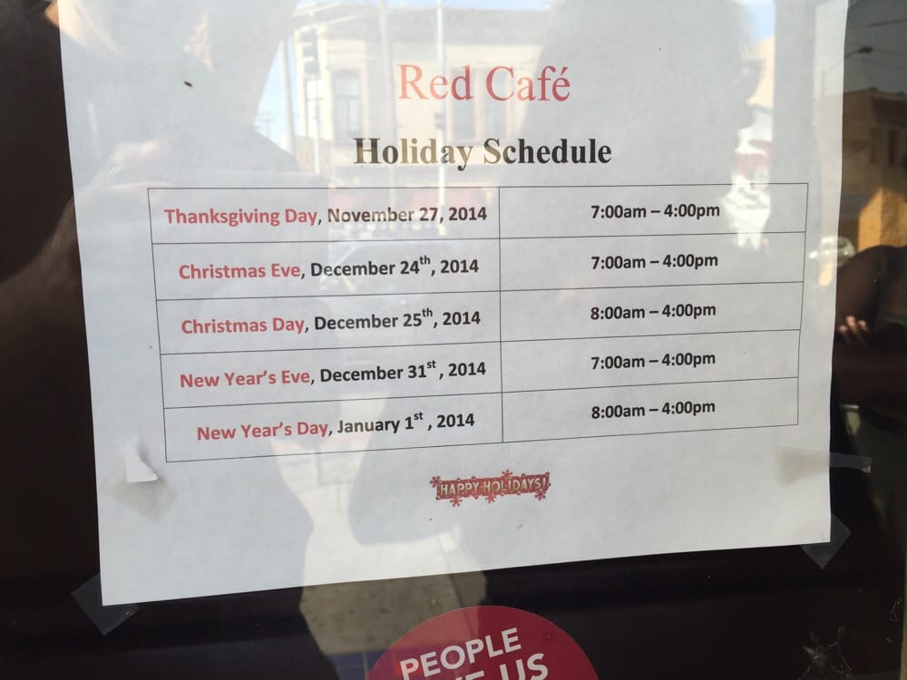 Welcome to Red Cafe, a charming diner nestled at 2894 Mission St, San Francisco. This cozy spot is perfect for breakfast or brunch, offering a diverse menu tailored to satisfy all palates. With a focus on both American and Mexican influences, there’s something for everyone—from hearty Vegetarian Omelettes packed with fresh ingredients to mouthwatering Camarones and Chicken Rancheros elegantly topped with homemade ranchero sauce.